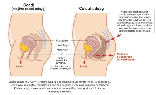Halkaan waxaa ku yaalla shan siyood oo mindhicirkaaga iyo kaadihaystaada looga dhigi karo caafimaad loogana ilaaliyo in calooshu fahdiisato:Si fiican wax u cun si aad uga dhigto mindhicirkaaga joogto mid u shaqeeya aadna u yeellato miisaan jireed oo caafimaad qaba Cun cunto caafimaad oo faybarku ku badan yahay (ugu yaraan 30g maalintii). Cab biyo badan si aad uga fogaato calooshu inay ku fadhiisato kaadi haystuna yeellato dhibsasho Cab 1.5 -2 Litir (6-8 galaas) oo biya ah maalin walba haddii aan si kale dhakhtarkaagu kuu sheegin. Cabitaanku waa biyaha, cabitaanka furutka, shaaha, kofeega, caanaha, jeliga, iyo icecream-ka. Maalin walba samay jimicsi si aad uga hortagto callooshu inay ku adkaato kana dhig miisaankaaga mid caafimaad qaba Ka dhig miskahaaga kuwa xoogan si ay si fiican ugu xakameeyaan kaadi haysta iyo mindhicirka Codaso xaashida jimicsiga miskaha adigoo wacaya khadka caawimada ee National Continence oo ah 1800 33 00 66. Dabeecada musqul aadista – Gal musqusha markaad u baahato si aad u faaruqiso mindhicirka si buuxda. Xasuuso inaad nasato. |