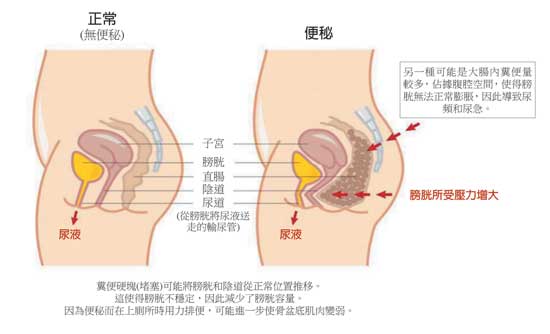 How constipation affects bladder controlConstipation can cause accidential leakage from your bladder. An overfull bowel will cut down the volume of urine your bladder can hold and you will feel the need to go to the toilet often and in a hurry. ![]() | 便秘如何影響小便控制便秘可引起膀胱意外漏尿。大腸過滿會减少膀胱能够存有的尿量,你會經常覺得要上厠所,而且尿急。 ![]() |