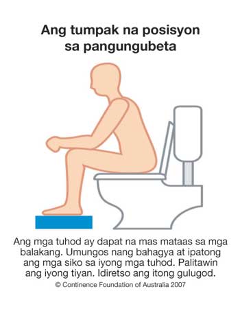 Narito ang limang paraan para panatilihing malusog ang iyong pantog at bituka at maiwasan ang pagtitibi:Kumain nang mabuti para panatilihing regular ang iyong mga pagdumi at magkaroon ng malusog na timbang ng katawan kumain ng isang malusog na diyetang mahimaymay (30g man lang kada araw). Uminom nang mabuti para maiwasan ang pagtitibi at iritasyon sa pantog Uminom ng 1.5-2 Litro(6-8 baso) ng l likido kada araw maliban kung iba ang ipinayo ng iyong doktor. Ang likido ay tubig, katas ng prutas, tsaa, kape, gatas, sopas, mga jelly, at ice cream. Mag-ehersisyo araw-araw para maiwasan ang pagtitibi at panatilihin ang malusog na timbang ng katawan Panatilihing malakas ang iyong pelvic floor para sa mainam na kontrol sa pantog at bituka Humiling ng polyeto ng ehersisyo para sa kalamnan ng pelvic floor sa pamamagitan ng pagtawag sa National Continence Helpline 1800 33 00 66. Mga gawi sa pangungubeta – Pumunta kaagad sa kubeta kapag kailangang magbawas at magbawas nang kumpleto. Tandaan na mag-relaks. |