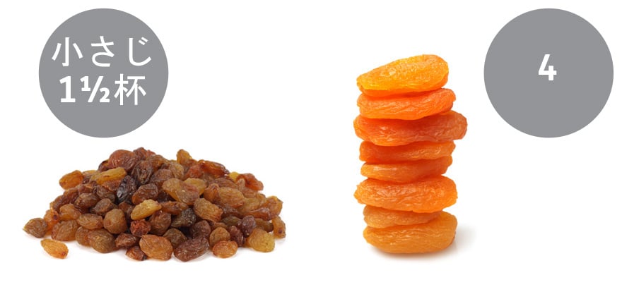 生鮮、缶詰、冷凍、あるいは干しブドウ、イチジク、プルーン、デイツなどのドライフルーツから選びます。 |
