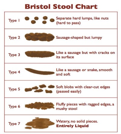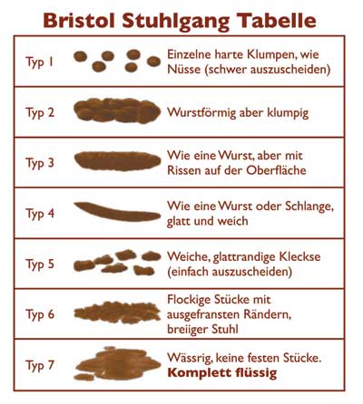 Wie sollte der Stuhlgang aussehen?Der Stuhlgang sollte hell- oder dunkelbraun, wurstförmig, weich aber fest, einfach auszuscheiden und von minimaler Geruchsbildung sein. Versuchen Sie Typ 3 oder Typ 4 Stuhlgang zu haben. ![]() |
