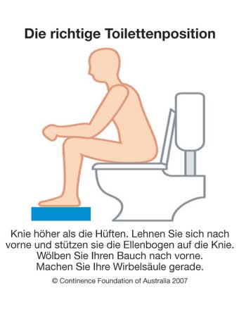 Hier sind fünf Wege, um Blase und Darm gesund zu erhalten und Verstopfung vorzubeugen:Achten Sie auf eine gute Ernährung für eine regelmäßige Verdauung und gesundes Körpergewicht Ernähren Sie sich ballaststoffreich (mindestens 30g pro Tag). Trinken Sie ausreichend um Verstopfung und Blasenirritation vorzubeugen Trinken Sie täglich 1.5 - 2 Liter (6-8 Gläser) Flüssigkeit, es sei denn, Ihr Arzt hat anderes verordnet. Flüssigkeiten sind Wasser, Fruchtsaft, Tee, Kaffee, Milch, Suppe, Gelees, und Eiscreme. Bewegen Sie sich täglich um Verstopfung vorzubeugen und ein gesundes Körpergewicht beizubehalten Stärken Sie Ihren Beckenboden für gute Blasen- und Darmkontrolle Fordern Sie unter folgender Nummer ein Merkblatt für Beckenbodentraining an: National Continence Helpline Toilettengewohnheiten –Gehen Sie zur Toilette sobald Sie müssen und entleeren Sie Ihren Darm vollständig. Denken Sie daran, zu entspannen. |