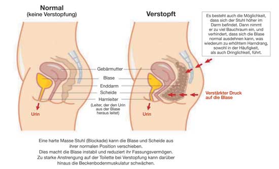 Wie Verstopfung die Blasenkontrolle beeinflusstVerstopfung kann zu unwillkürlichem Harnverlust führen. Ein überfüllter Darm verringert das Fassungsvermögen der Blase, und man hat das Gefühl, oft und sehr dringend auf die Toilette zu müssen. ![]() |