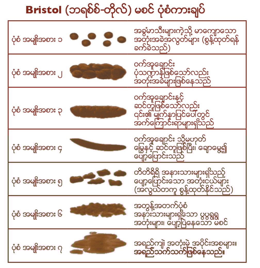 What should your 'poo' look like?Your poo should be light or dark brown, sausage-shaped, soft but firm, easy to pass and with minimal odour. Aim to have a type 3 or type 4 bowel action. | သင့္ “ေခ်း” မည္သို႔ ပံုေပါက္သင့္သနည္း။သင့္ေခ်းသည္ အညိဳေဖ်ာ့ေရာင္ သို႔မဟုတ္ အညိဳရင့္ေရာင္၊ ဝက္အူေခ်ာင္း ပံုသ႑ာန္ရွိကာ၊ ေပ်ာ့ေျပာင္းမႈရွိေသာ္လည္း သိပ္သည္းမႈရွိ၍၊ အလြယ္တကူ စြန္႔ႏိုင္ၿပီး၊ အနံ႔အသက္ အနည္းဆံုးရွိသင့္ပါသည္။ ဝမ္းသြားျခင္း ပံုစံ အမ်ဳိးအစား ၃ သို႔မဟုတ္ ပံုစံ အမ်ဳိးအစား ၄ ျဖစ္ေစရန္ ရည္မွန္းပါ။ |