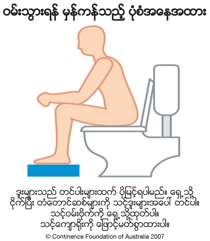 Here are five ways to keep your bladder and bowel healthy and prevent constipation:Eat well to keep your bowels regular and to have a healthy body weight Eat a healthy diet high in fibre (at least 30g per day). Drink well to prevent constipation and bladder irritation Drink 1.5 -2 Litres(6-8 glasses) of fluid each day unless advised otherwise by your doctor. Fluid is water, fruit juice, tea, coffee, milk, soup, jellies and icecream. Exercise daily to prevent constipation and keep a healthy body weight Keep your pelvic floor strong for good bladder and bowel control Request a pelvic floor muscle exercise leaflet by calling the National Continence Helpline 1800 33 00 66. Toileting habits - Go to the toilet as soon as you need to and empty you bowel fully. Remember to relax. | ေအာက္ပါတို႔သည္ သင့္ဆီးအိမ္ ႏွင့္ ဝမ္းကို က်န္းမာေရးႏွင့္ ညီၫြတ္ေနေစၿပီး ဝမ္းမခ်ဳပ္ရန္ ကာကြယ္ေပးႏိုင္ေသာ နည္းငါးမ်ဳိးျဖစ္ပါသည္။သင့္ဝမ္း မွန္ေနေစရန္ႏွင့္ က်န္းမာေရးႏွင့္ ညီၫြတ္ေစရန္ ကိုယ္အေလးခ်ိန္ရွိေရးအတြက္ ေကာင္းေကာင္းမြန္မြန္ စားပါ အမွ်င္အေျမာက္အျမားပါရွိေသာ က်န္းမာေရးႏွင့္ ညီၫြတ္ေစရာ အစားအစာမ်ားကို စားေသာက္ပါ (တစ္ေန႔လွ်င္ အနည္းဆံုး ၃၀ ဂရမ္)။ ဝမ္းမခ်ဳပ္ရန္ ကာကြယ္ေပးၿပီး ဆီးအိမ္ အဆြမခံရရန္ ေကာင္းေကာင္းမြန္မြန္ေသာက္ပါ သင့္ဆရာဝန္က မလုပ္ႏွင့္ဟု အႀကံမျပဳသမွ်၊ ေန႔စဥ္ ၁.၅ မွ ၂ လီတာ (၆ ခြက္မွ ၈ ခြက္အထိ) အရည္ကိုေသာက္ပါ။ အရည္ဆိုသည္မွာ ေရ၊ သစ္သီးအရည္၊ လက္ဖက္ရည္၊ ေကာ္ဖီ၊ ႏြားႏို႔၊ ဂ်ယ္လီ ႏွင့္ ေရခဲမုန္႔တို႔ျဖစ္ပါသည္။ ဝမ္းမခ်ဳပ္ရန္ ကာကြယ္ေပးၿပီး က်န္းမာေရးႏွင့္ ညီၫြတ္ေစေသာ ကိုယ္အေလးခ်ိန္ရွိရန္အတြက္ ေလ့က်င့္ခန္းကို ေန႔စဥ္လုပ္ပါ ဆီး/ဝမ္း ခ်ဳပ္ထိန္းႏိုင္မႈ အားေကာင္းေစရန္အတြက္ သင့္တင္ပါးဆံုခြက္ႂကြက္သားမ်ားကို သန္မာေနေစရန္ျပဳလုပ္ပါ တစ္ျပည္လံုးဆိုင္ရာ ဆီး/ဝမ္း ထိန္းႏိုင္မႈဆိုင္ရာ ကူညီေရးဖုန္းလိုင္း ၁၈၀၀ ၃၃ ၀၀ ၆၆ ကို ဖုန္းဆက္ၿပီး တင္ပါးဆံုခြက္ႂကြက္သားမ်ားဆိုင္ရာ ေလ့က်င့္ခန္းစာေစာင္ကို ေတာင္းခံပါ။ အိမ္သာသြားသည့္ အေလ့အက်င့္မ်ား။ သင္ ဝမ္းသြားရန္လိုအပ္သည့္အခါ၌ ခ်က္ျခင္းသြားၿပီး ကုန္စင္ေအာင္ စြန္႔ပါ။ သက္ေသာင့္သက္သာရွိစြာေနရန္ မေမ့ပါႏွင့္။ |