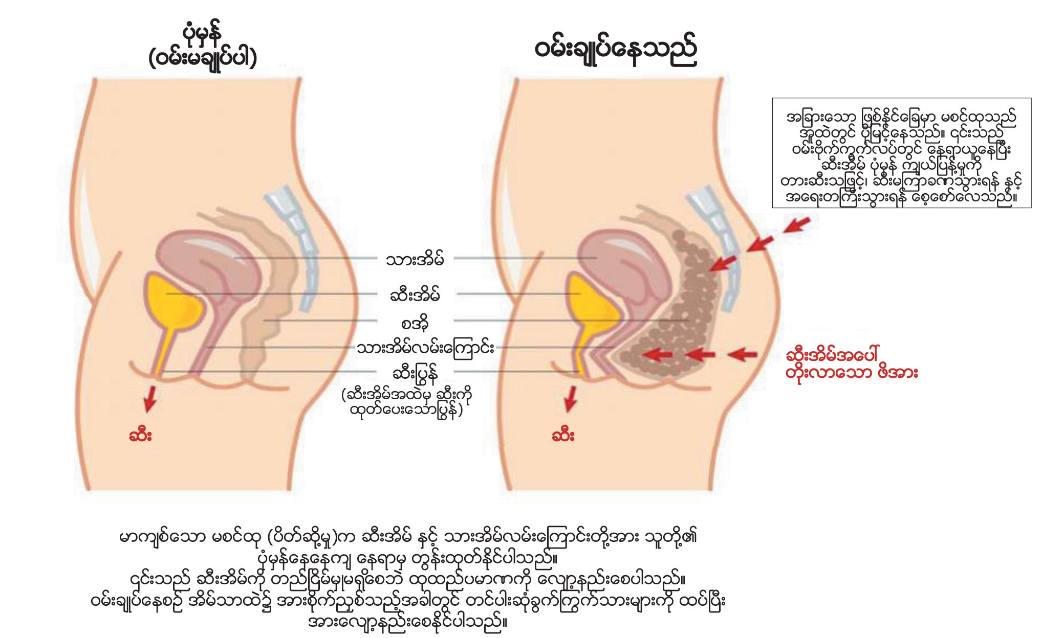 How constipation affects bladder controlConstipation can cause accidential leakage from your bladder. An overfull bowel will cut down the volume of urine your bladder can hold and you will feel the need to go to the toilet often and in a hurry. | ဝမ္းခ်ဳပ္ျခင္းက ဆီးအိမ္ ခ်ဳပ္ထိန္းမႈအေပၚ အက်ဳိးသက္ေရာက္မႈရွိပံုဝမ္းခ်ဳပ္သည့္အခါ၌ သင့္ဆီးအိမ္ကို မေတာ္တဆ စိမ့္ယိုေစႏိုင္ပါသည္။ ပိုလွ်ံျပည့္ေနေသာ အူမသည္ သင့္ဆီးအိမ္က ထိန္းထားႏိုင္ေသာ ဆီးပမာဏကို ေလ်ာ့နည္းေစလိမ့္မည္ျဖစ္ၿပီး၊ သင့္၌ မၾကာခဏ အိမ္သာတက္ရန္ ႏွင့္ အေလာတႀကီးသြားရန္ လိုအပ္စိတ္ ျဖစ္ေပၚေစပါလိမ့္မည္။ |