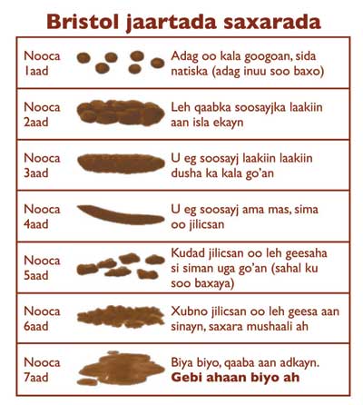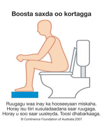 Halkaan waxaa ku yaalla shan siyood oo mindhicirkaaga iyo kaadihaystaada looga dhigi karo caafimaad loogana ilaaliyo in calooshu fahdiisato:Si fiican wax u cun si aad uga dhigto mindhicirkaaga joogto mid u shaqeeya aadna u yeellato miisaan jireed oo caafimaad qaba Cun cunto caafimaad oo faybarku ku badan yahay (ugu yaraan 30g maalintii). Cab biyo badan si aad uga fogaato calooshu inay ku fadhiisato kaadi haystuna yeellato dhibsasho Cab 1.5 -2 Litir (6-8 galaas) oo biya ah maalin walba haddii aan si kale dhakhtarkaagu kuu sheegin. Cabitaanku waa biyaha, cabitaanka furutka, shaaha, kofeega, caanaha, jeliga, iyo icecream-ka. Maalin walba samay jimicsi si aad uga hortagto callooshu inay ku adkaato kana dhig miisaankaaga mid caafimaad qaba Ka dhig miskahaaga kuwa xoogan si ay si fiican ugu xakameeyaan kaadi haysta iyo mindhicirka Codaso xaashida jimicsiga miskaha adigoo wacaya khadka caawimada ee National Continence oo ah 1800 33 00 66. Dabeecada musqul aadista – Gal musqusha markaad u baahato si aad u faaruqiso mindhicirka si buuxda. Xasuuso inaad nasato. |