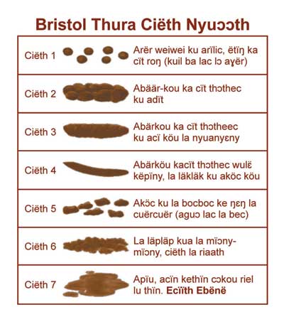 Kuɛr kadhiëc akënë lëu bïn ka alënydu ku yänydu cɔl arɛ̈ɛ̈r kapiɔl ku gël kuil:Cäm apiath ba yänydu cɔl arɛ̈r kapiɛth aköl luöt ku da guöp la läkläk kë cï cuaidït Cäm miëth la möt-möt dëic wäl lapiɔth (lööm kakor 30g aköl tökic). Dëk pïu juëc ba kuil cɔl akɔ̈c ku arëm alëc Ka laulau ë cɔl pïu, 'fruit' pïu alemun, cääi, kopp, caa, cuai, aläwa dïny ku icecream. Ye tuk aköl luöt ba cuëi ku la ror kerïl-köu gël wei yï guöp Cɔl ɣöidu arër karïl ba alëc piath ku tïet töör Ŋïëc la ror – Lɔr pakäna emɛn tënë yïn röt yök kewïc la ku thöl pël ebën abï yäc yïc thök. Ku ŋïc ba guöp luac pïny apiɛth. |